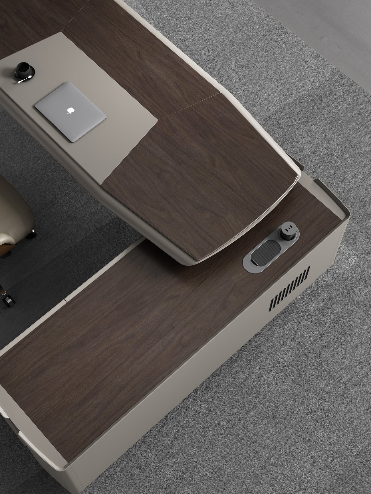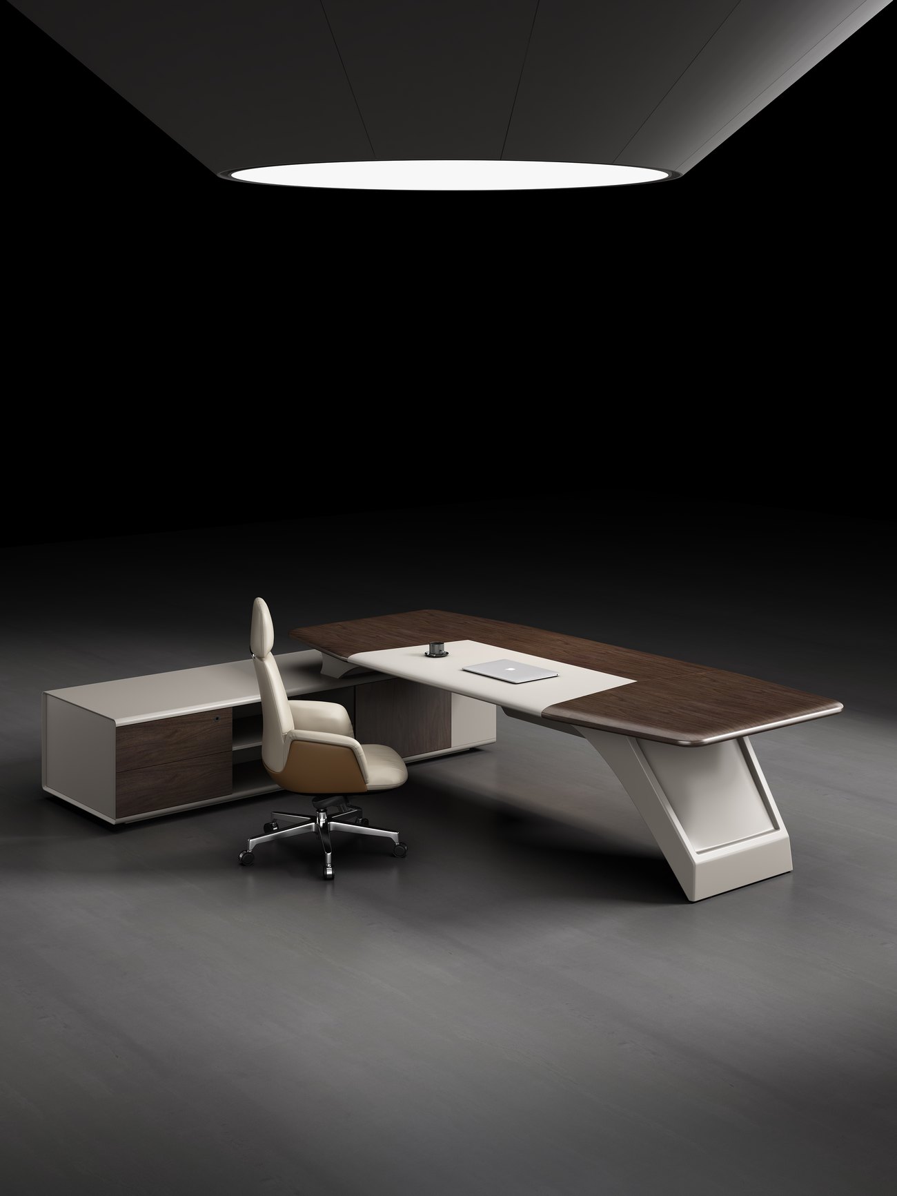 整体设计元素来自于名酒包装设计, 圆润的线条加上钻石切割工艺使整个班台线条流畅造型美观, 台脚采用玻璃钢一次成型, 无论是外观和稳定性都体现了富豪制作工艺的精湛和设计领先,超宽台面设计使其整个外形大气美观, 而人体接触面则采用包皮设计, 接触时温馨舒适, 副柜采用了指纹锁和超级电源, 科技满满的配置极大的满足了客户需求, 同时也提升了产品的整体定位和档次, 配套的书柜同样采用的配件也是高级的五金和玻璃, 暖色的灯带更是为办公空间缓解了一天的劳累。